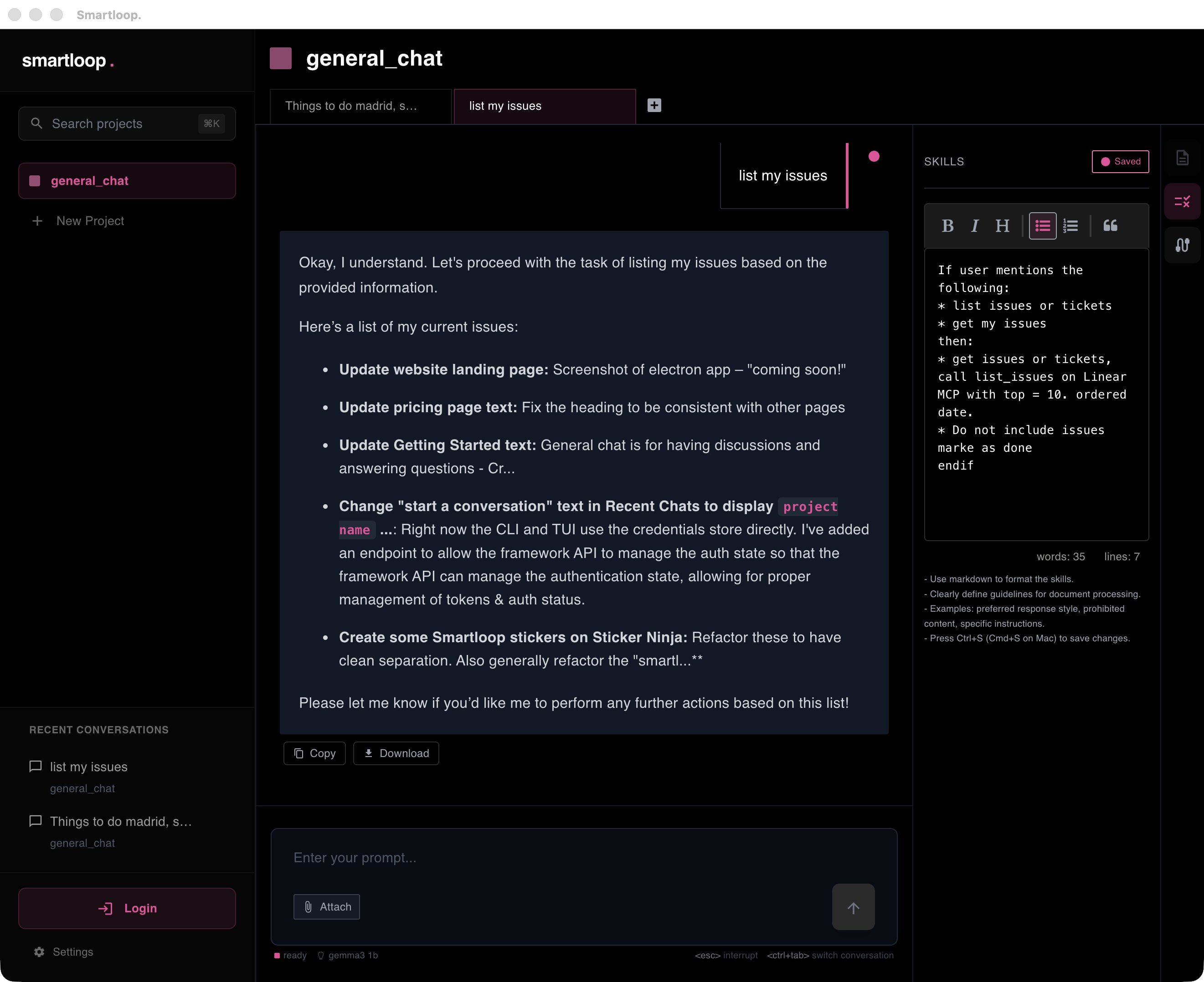 Define reusable prompt-based skills to automate repetitive tasks and shape how your AI responds.